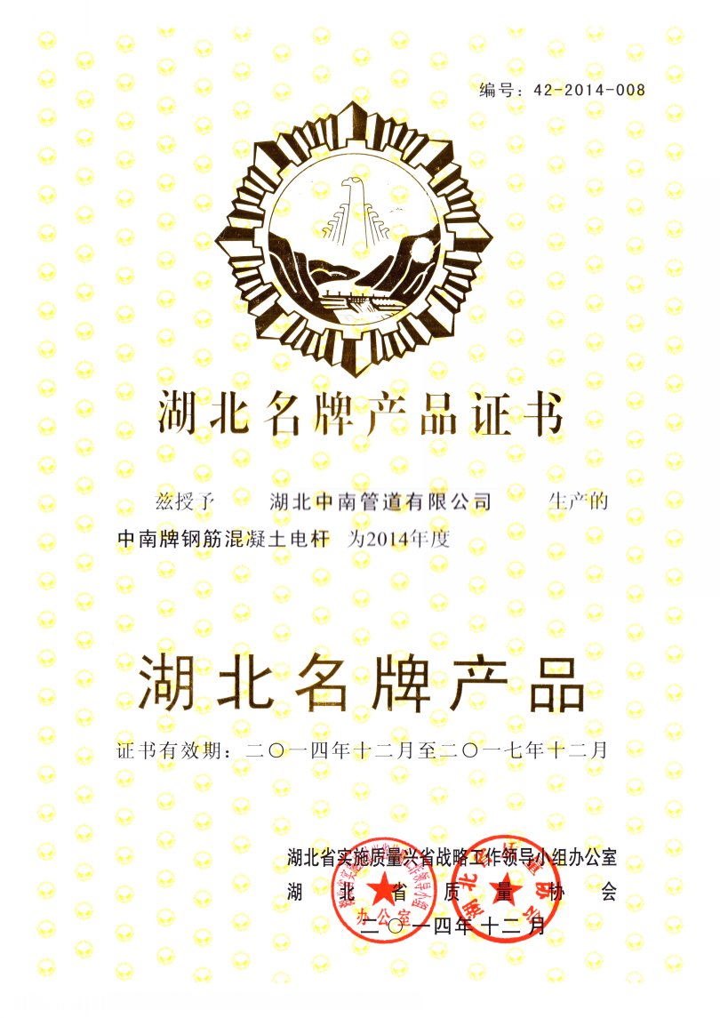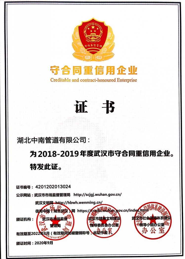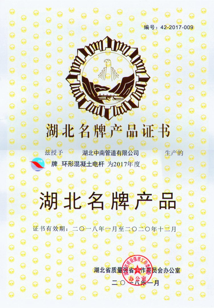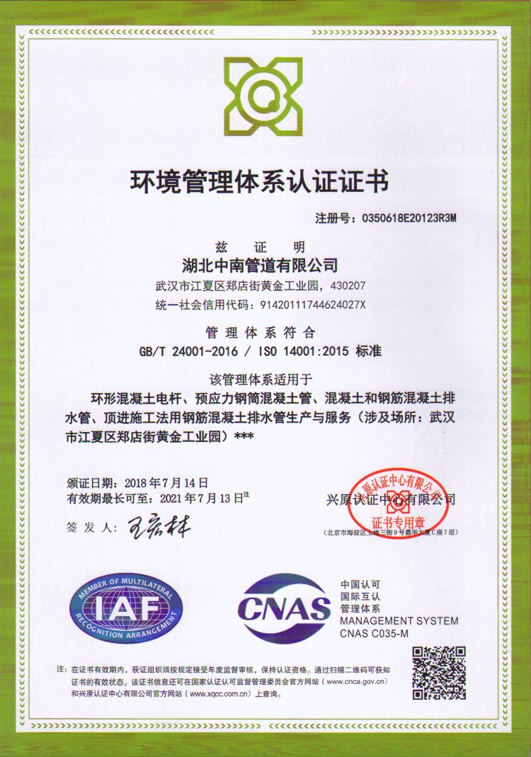 湖北中南管道有限公司始建于1952年,原属国家建材部直属企业,是国家三大水泥制品骨干企业之一。曾为中国第一座长江大桥——武汉长江大桥生产特制大桥杆;为马耳他等国援建多座水泥制品厂;首创的国内环形力混凝土电杆和三阶段混凝土压力管荣获1978年全国科技大会科研成果奖及优秀产品奖。公司现有资产规模亿元,拥有25项实用新型专利、3项发明专利,是国家大力支持和发展的高新技术企业。主要生产环形混凝土电杆、预应力钢筒混凝土管、钢筋混凝土排水管、顶进施工法用钢筒混凝土管、预制混凝土箱涵、钢筋混凝土异形管等产品,是《环形混凝土电杆》、《预应力钢筒混凝土管》、《混凝土和钢筋混凝土排水管》、《预制混凝土箱涵》、《异形钢筋混凝土异形管》、《混凝土和钢筋混凝土排水管试验方法》、《管廊工程用预制混凝土制品试验方法》等国家标准的参编单位,目前担任全国混凝土与水泥制品协会常务理事单位、湖北省混凝土与水泥制品协会会长单位。